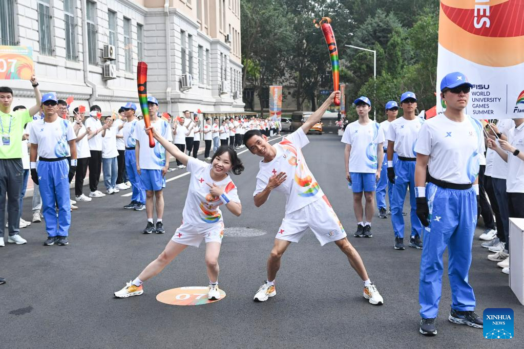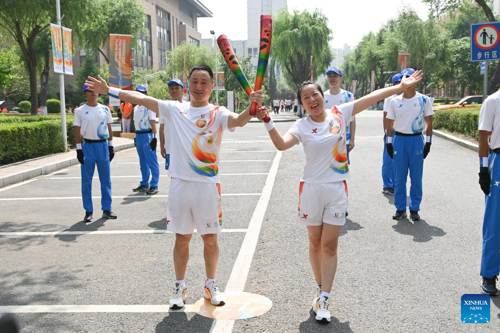 Torch bearers Dong Guojian (R) and Dai Xiaozhen pose during the torch relay of the Chengdu 2021 FISU Summer World University Games at Harbin Institute of Technology in Harbin, northeast China's Heilongjiang Province, June 15, 2023. (Xinhua/Xie Jianfei)