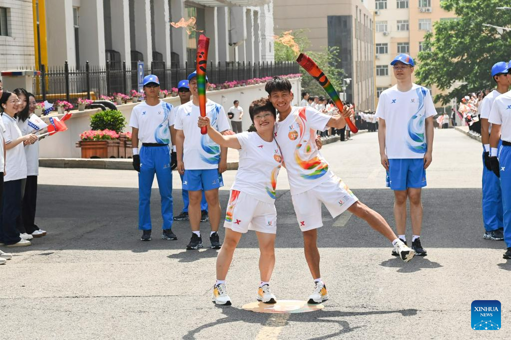 Torch bearers Jiang Tian (R) and Liu Xiaoyong attend the torch relay of the Chengdu 2021 FISU Summer World University Games at Harbin Institute of Technology in Harbin, northeast China's Heilongjiang Province, June 15, 2023. (Xinhua/Xie Jianfei)