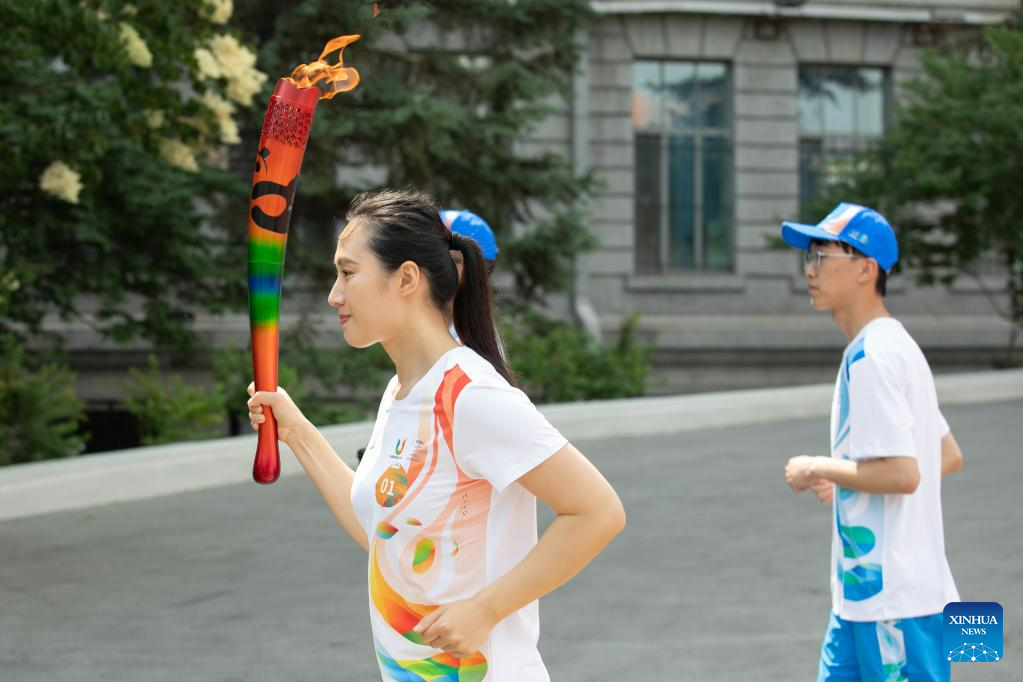 Torch bearer Zhang Xin runs with the torch during the torch relay of the Chengdu 2021 FISU Summer World University Games at Harbin Institute of Technology in Harbin, northeast China's Heilongjiang Province, June 15, 2023. (Xinhua/Xie Jianfei)