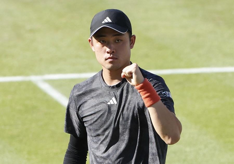 Wu Yibing of China reacts during his first round match against Nick Kyrgios of Australia at Boss Open 2023 tennis tournament in Stuttgart, Germany, June 13, 2023. (Photo by Philippe Ruiz/Xinhua)