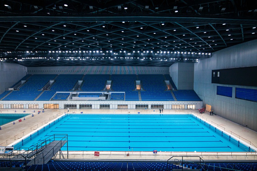 Photo taken on April 12, 2021 shows an interior view of the Hangzhou Olympic Sports Center Aquatic Sports Arena, a venue of the Hangzhou 2022 Asian Games in Hangzhou, east China's Zhejiang Province. (Xinhua/Jiang Han)