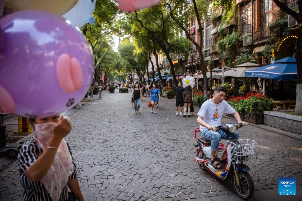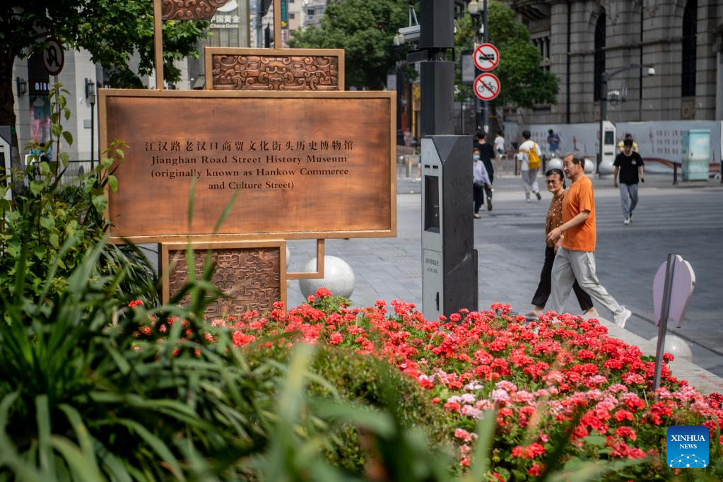 Tourists walk on Jianghan Road, a signature pedestrian street of Hankou historical area, in Wuhan, central China's Hubei Province, June 15, 2023. Covering an area of 6.02 square kilometers, the Hankou historical area in the heart of Wuhan City's old town, boasts an abundance of historical and cultural heritages.