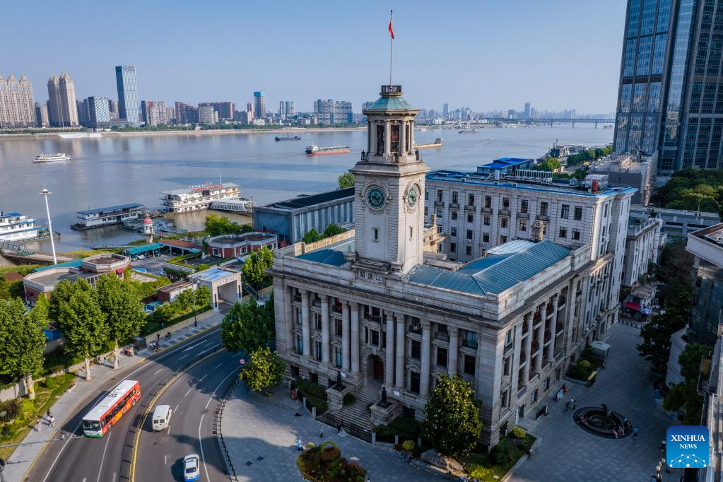 This aerial photo taken on June 6, 2023 shows the Hankow Customs House in Wuhan, central China's Hubei Province. Covering an area of 6.02 square kilometers, the Hankou historical area in the heart of Wuhan City's old town, boasts an abundance of historical and cultural heritages.