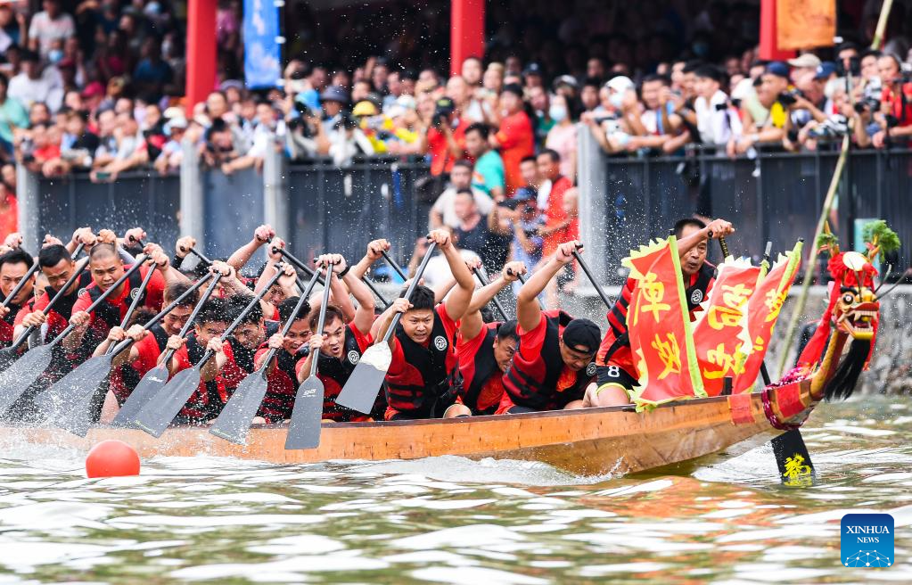 People take part in a dragon boat racing in Guangzhou, south China's Guangdong Province, June 15, 2023.