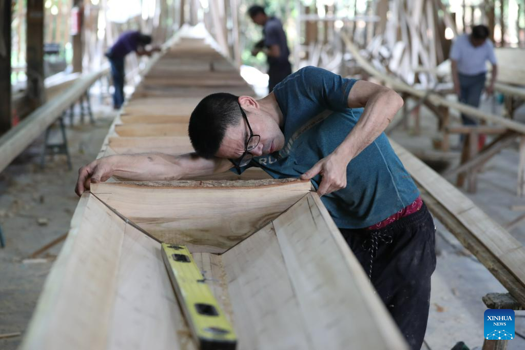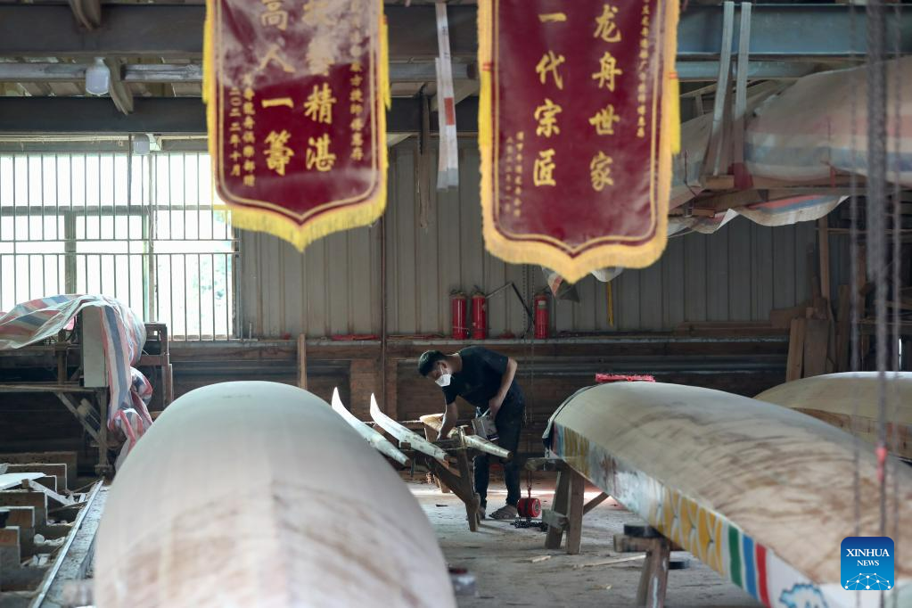 Craftsmen make a dragon boat in Fangzhuang Village, Minhou County, Fuzhou City, southeast China's Fujian Province, May 23, 2023.
