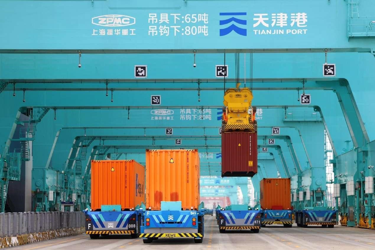 At an intelligent container terminal of the port of Tianjin in north China, 12 automatic ship-to-shore gantry cranes, 92 smart transport vehicles and 42 gantry cranes were running at full capacity, handling cargo from across the world. No manual work was observed at the terminal.