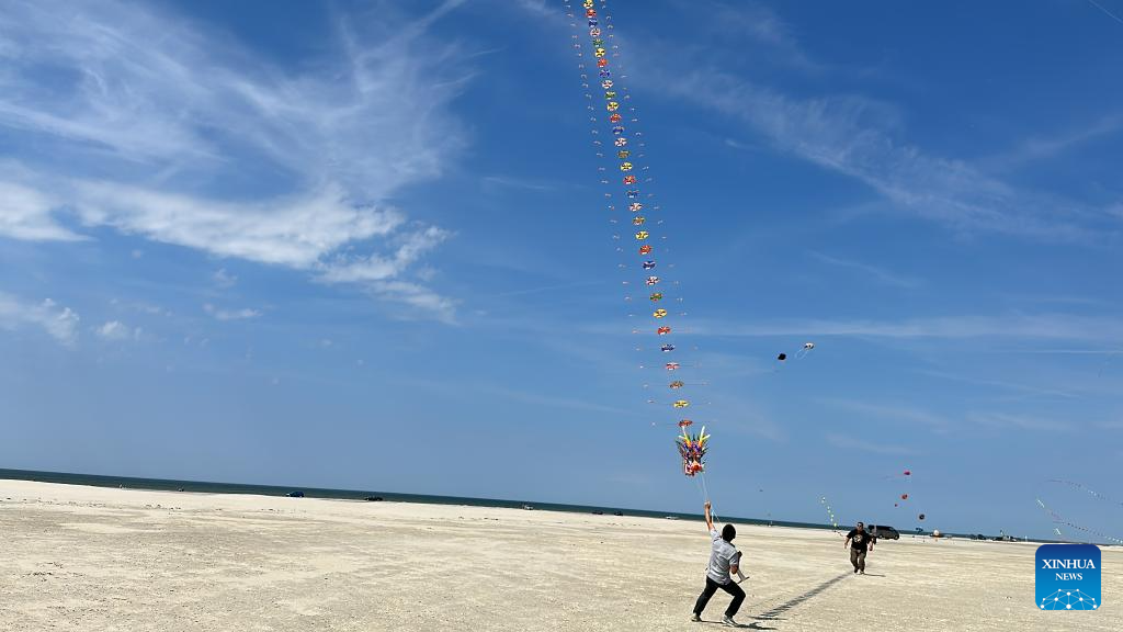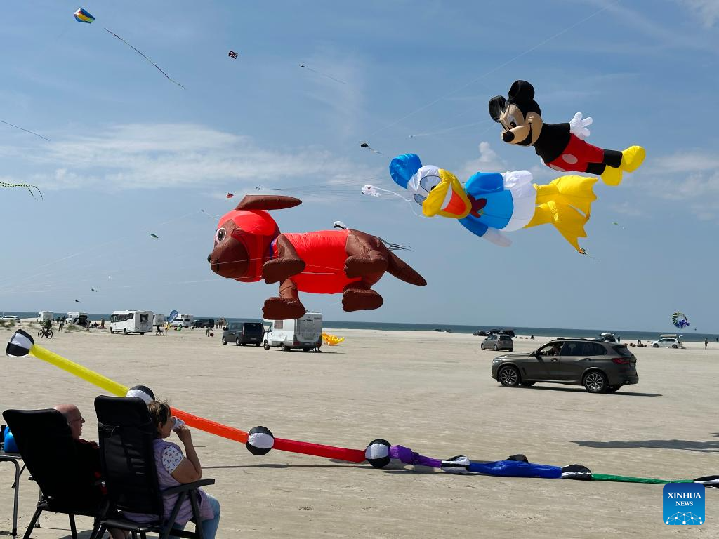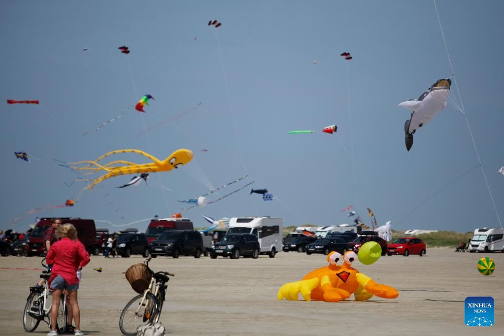 People fly kites during an international kite festival in Fanoe, Denmark, on June 13, 2023. (Xinhua/Lin Jing)