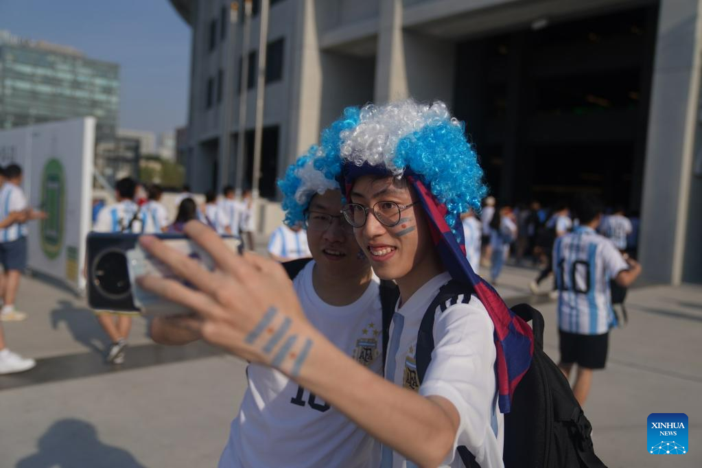Fans pose for photos ahead of an international football invitational between Argentina and Australia in Beijing, capital of China, June 15, 2023. (Xinhua/Peng Ziyang)