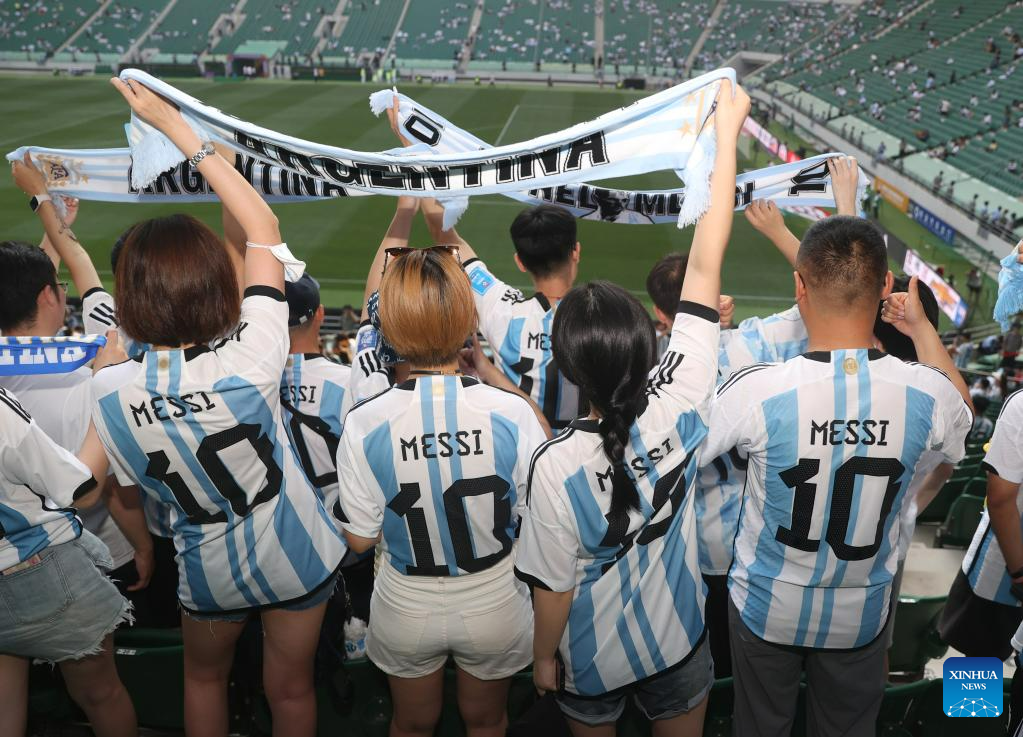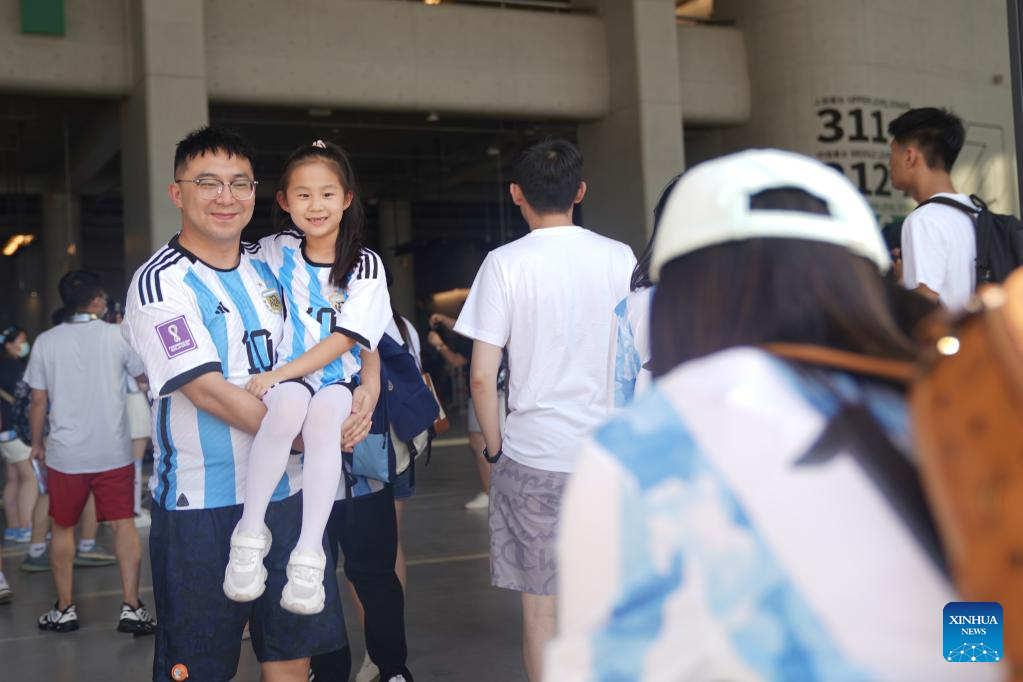 Fans are seen ahead of an international football invitational between Argentina and Australia in Beijing, capital of China, June 15, 2023. (Xinhua/Zhang Chen)