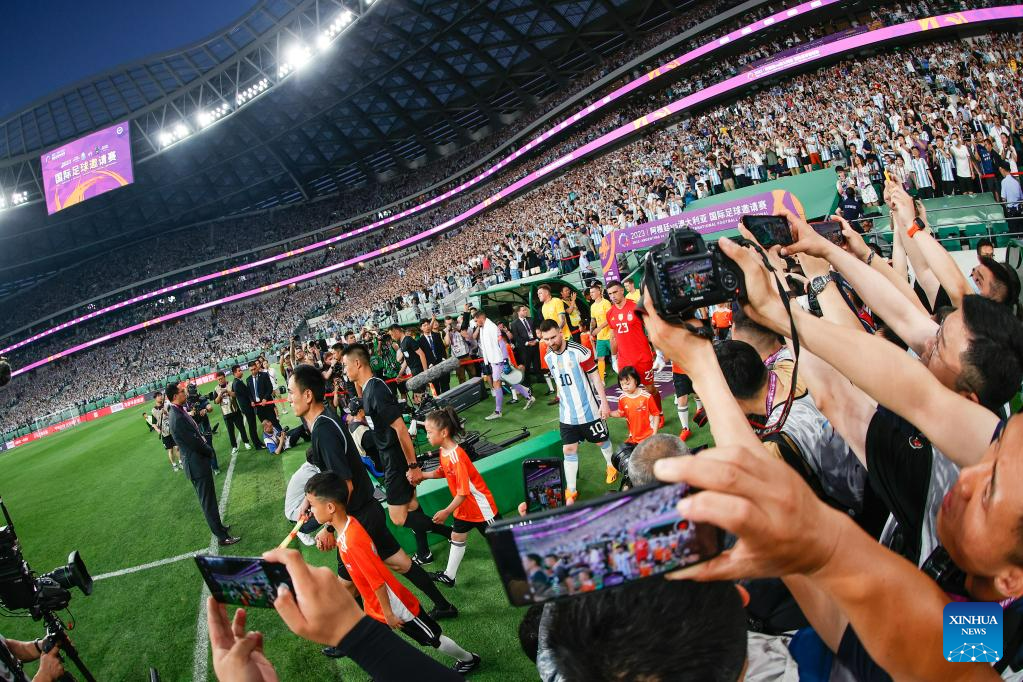 Players of both sides enter the field of play ahead of an international football invitational between Argentina and Australia in Beijing, capital of China, June 15, 2023. (Xinhua/Wang Lili)