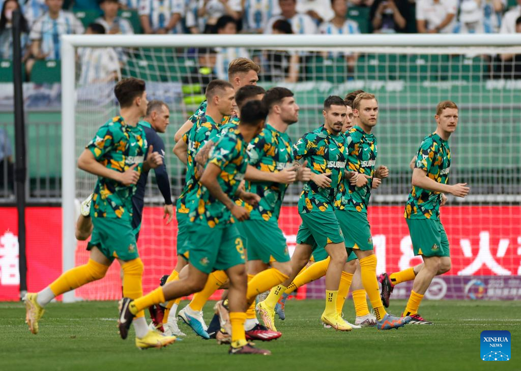 Players of Australia warm up ahead of an international football invitational between Argentina and Australia in Beijing, capital of China, June 15, 2023. (Xinhua/Zhang Chen)