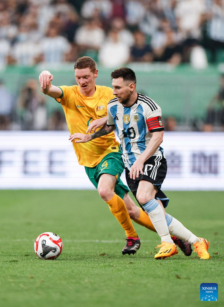 Lionel Messi (R) of Argentina vies with Kye Rowles of Australia during an international football invitational between Argentina and Australia in Beijing, capital of China, June 15, 2023. (Xinhua/Wang Lili)