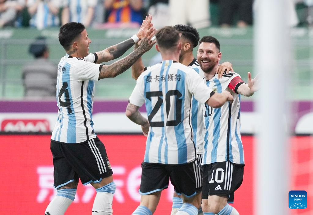 Players of Argentina celebrate the goal of Lionel Messi during an international football invitational between Argentina and Australia in Beijing, capital of China, June 15, 2023. (Xinhua/Jia Haocheng)