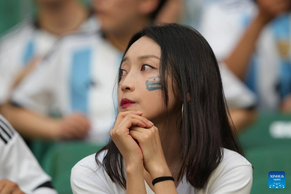 A fan reacts ahead of an international football invitational between Argentina and Australia in Beijing, capital of China, June 15, 2023. (Xinhua/Peng Ziyang)