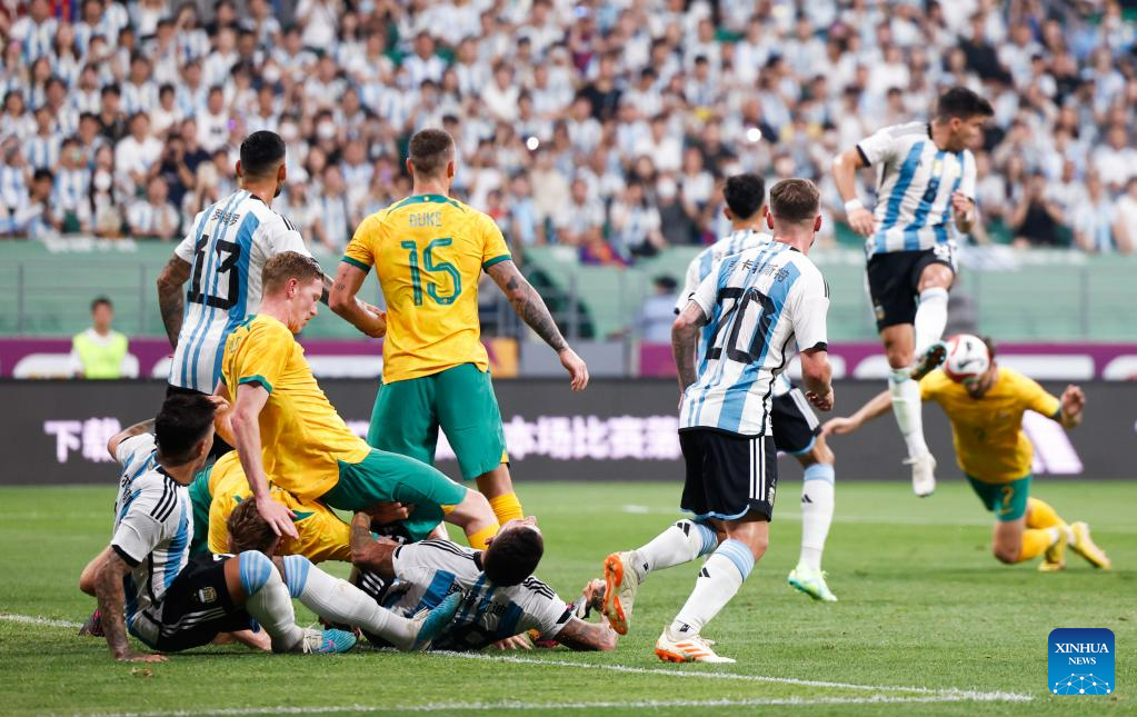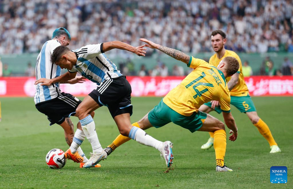 Players compete during an international football invitational between Argentina and Australia in Beijing, capital of China, June 15, 2023. (Xinhua/Wang Lili)