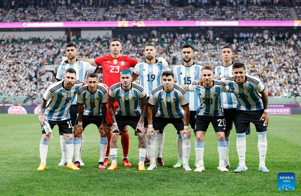 Players of Argentina line up ahead of an international football invitational between Argentina and Australia in Beijing, capital of China, June 15, 2023. (Xinhua/Wang Lili)