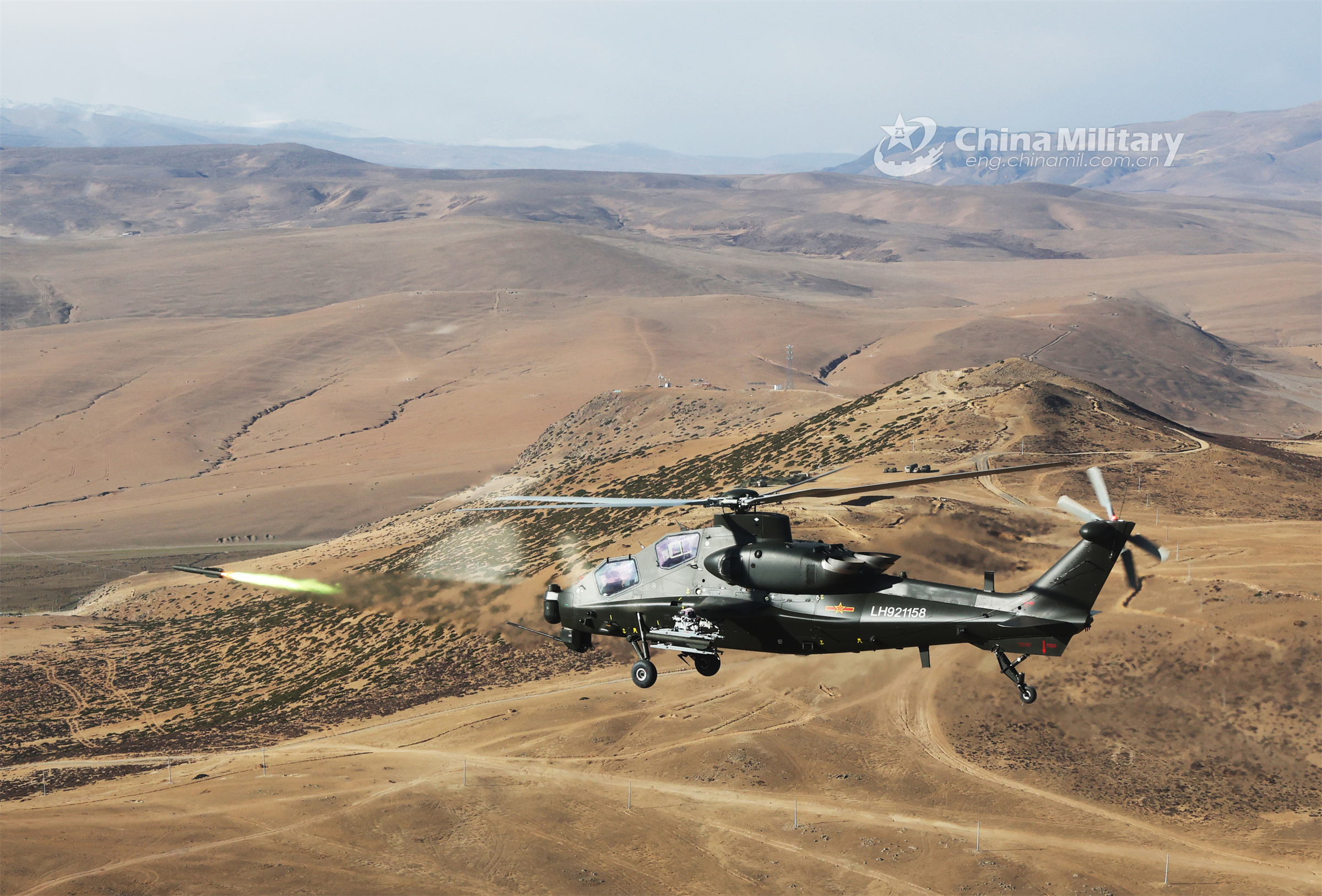 An attack helicopter attached to a brigade under the PLA Xizang Military Command fires an air-to-air missile at a mock target during a recent live-fire training exercise. (eng.chinamil.com.cn/Photo by Hu Qiwu)