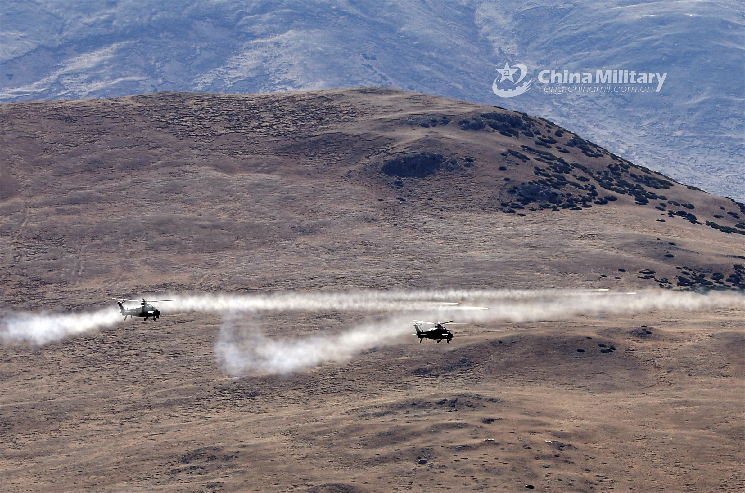 Attack helicopters attached to a brigade under the PLA Xizang Military Command fire rockets at mock targets during a recent live-fire training exercise. (eng.chinamil.com.cn/Photo by Hu Qiwu)
