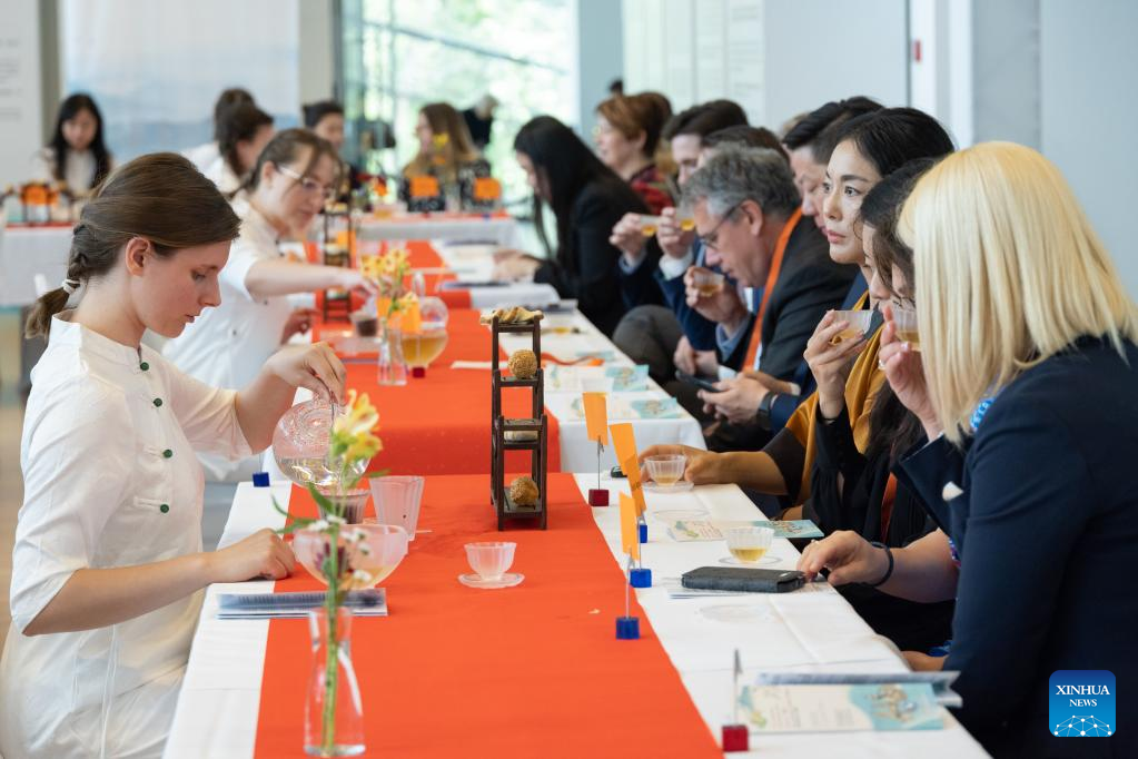 Guests taste tea at the opening ceremony of a Chinese tea culture-themed exhibition at the Museum of Ethnography in Budapest, Hungary on June 16, 2023. (Photo by Attila Volgyi/Xinhua)