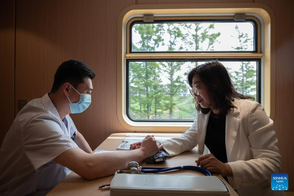 A passenger is treated by a traditional Chinese medicine practitioner aboard a tourist train in northeast China's Heilongjiang Province, June 18, 2023.?(Xinhua/Zhang Tao)