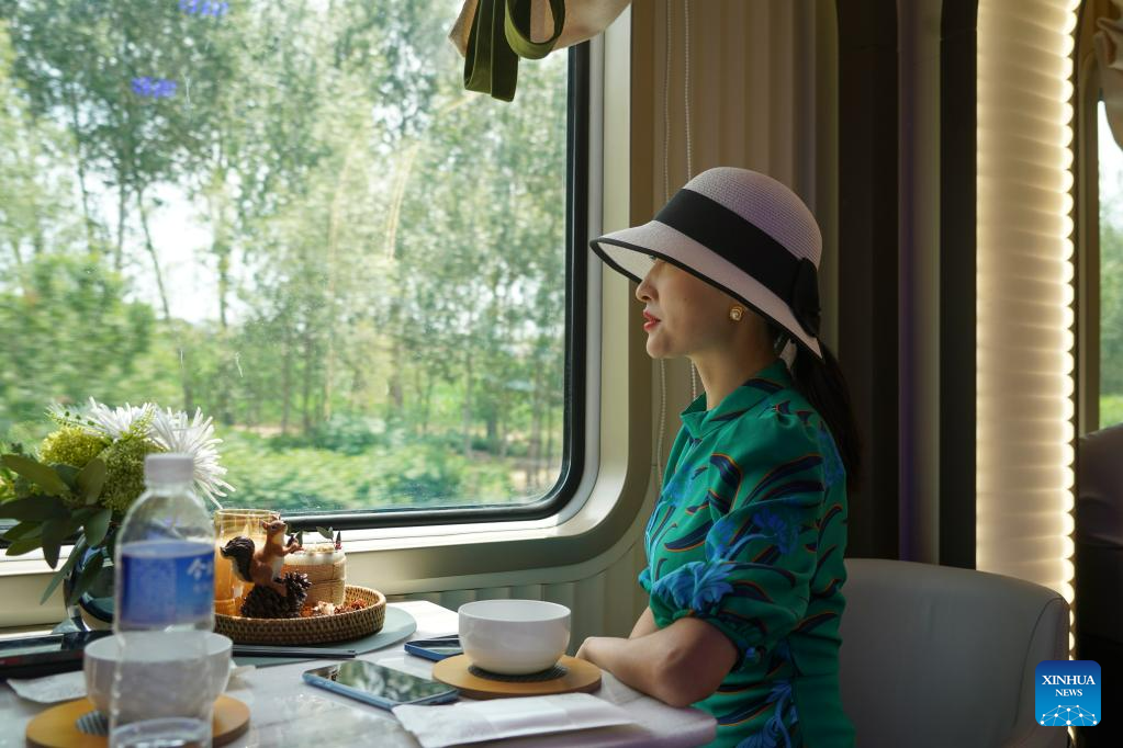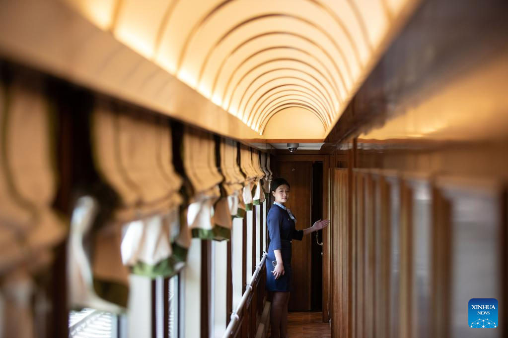 A train attendant works aboard a tourist train in northeast China's Heilongjiang Province, June 18, 2023.?(Xinhua/Zhang Tao)