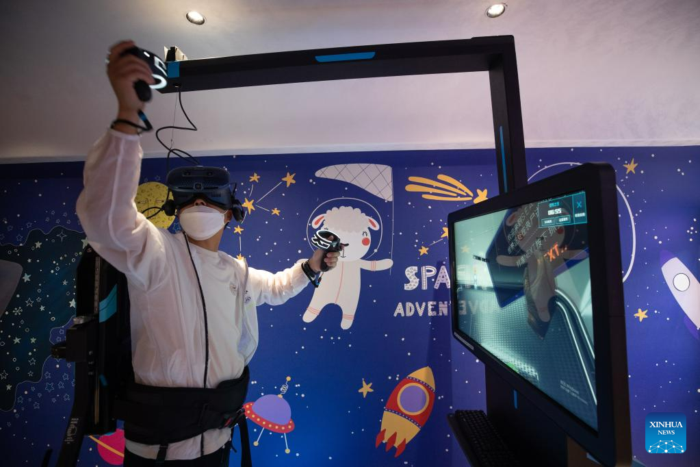 A passenger plays via gaming facilities aboard a tourist train in northeast China's Heilongjiang Province, June 18, 2023. (Xinhua/Zhang Tao)