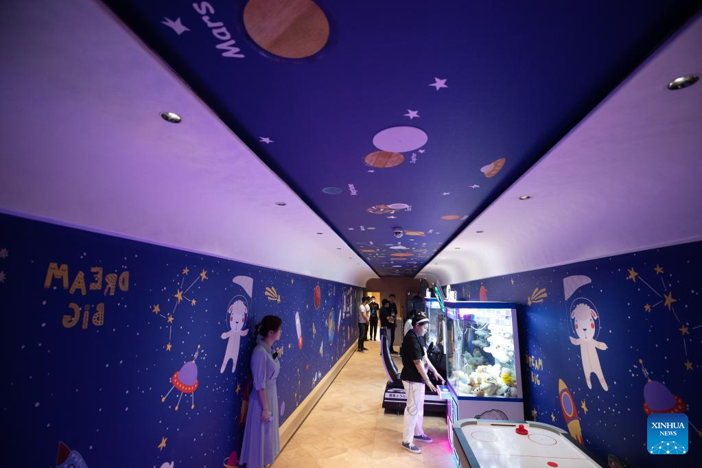Passengers have fun via entertainment facilities aboard a tourist train in northeast China's Heilongjiang Province, June 18, 2023.?(Xinhua/Zhang Tao)