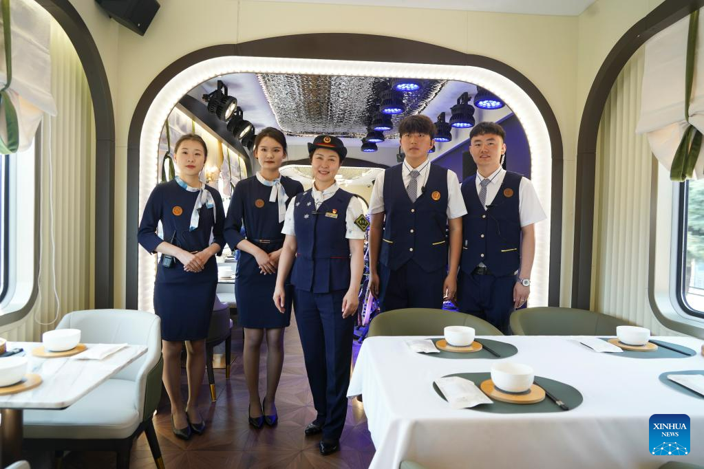 Train attendants pose for a photo aboard a tourist train in northeast China's Heilongjiang Province, June 18, 2023.?(Xinhua/Wang Dayu)