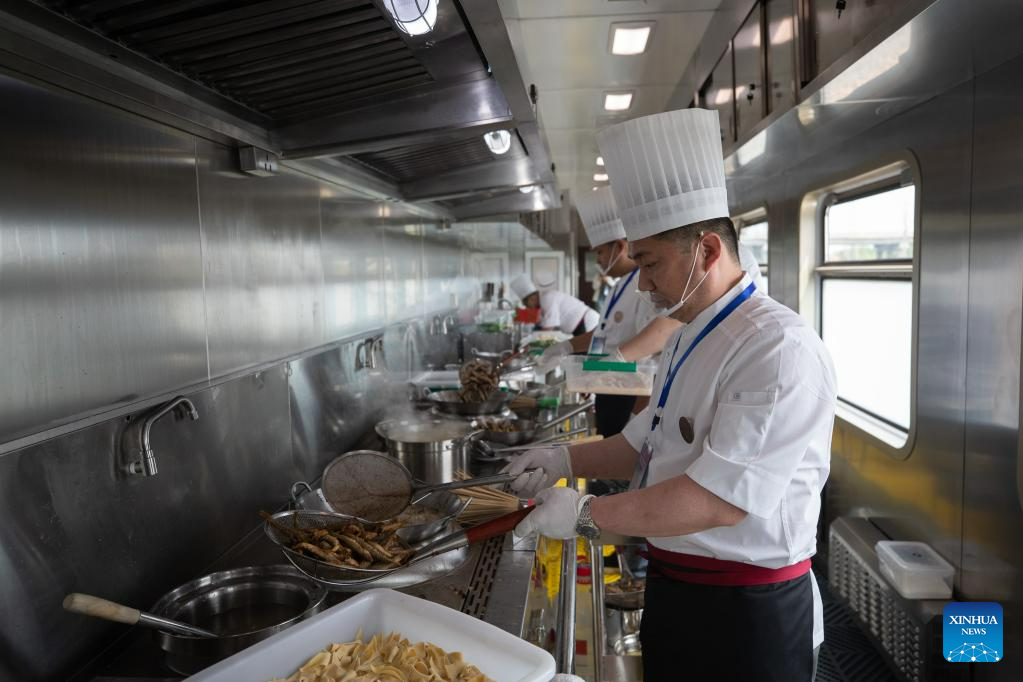 Chefs cook meals aboard a tourist train in northeast China's Heilongjiang Province, June 18, 2023.?(Xinhua/Zhang Tao)