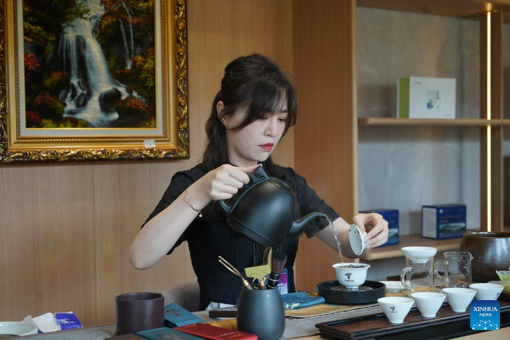 A technician makes tea aboard a tourist train in northeast China's Heilongjiang Province, June 18, 2023.?(Xinhua/Wang Dayu)