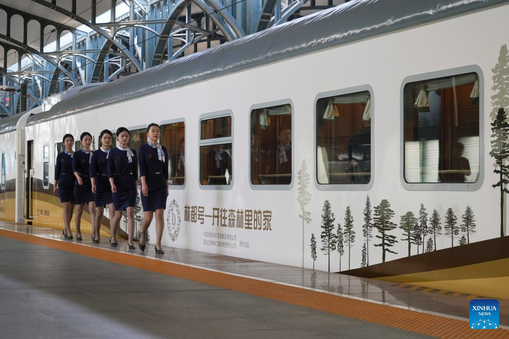 Carrying about 200 passengers, a tourist train left Harbin on Sunday for China's "forest capital" Yichun city in Heilongjiang Province. The train offers passengers a comfortable experience with its facilities and magnificent views as it traverses through a wide span of forests.