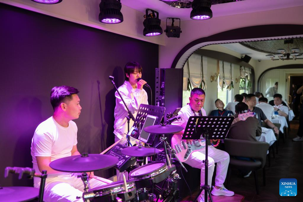 A band performs aboard a tourist train in northeast China's Heilongjiang Province, June 18, 2023.?(Xinhua/Zhang Tao)