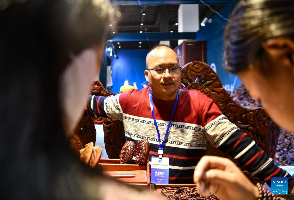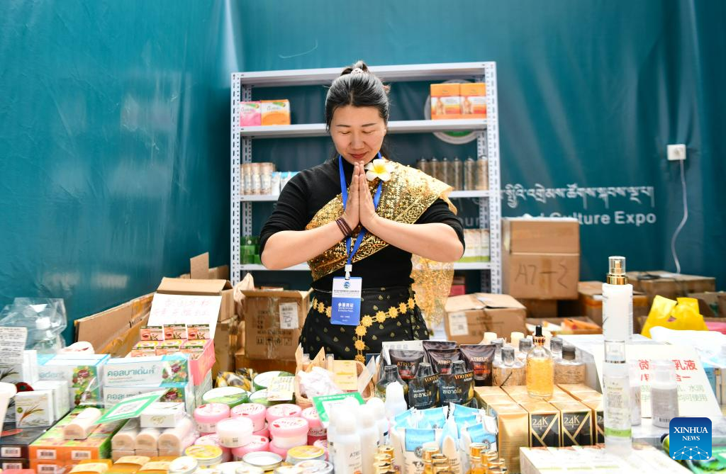 A trader selling products from Vietnam at the 5th China Xizang Tourism and Culture Expo in Lhasa, capital of southwest China's Tibet Autonomous Region, June 18, 2023. The expo is one of the most important events on Tibet's cultural calendar. (Xinhua/Jigme Dorje)