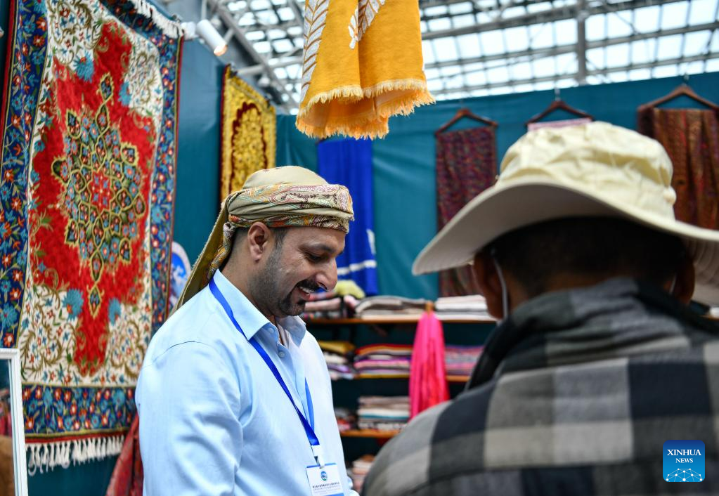 An Indian trader sells products at the 5th China Xizang Tourism and Culture Expo in Lhasa, capital of southwest China's Tibet Autonomous Region, June 18, 2023. The expo is one of the most important events on Tibet's cultural calendar. (Xinhua/Jigme Dorje)