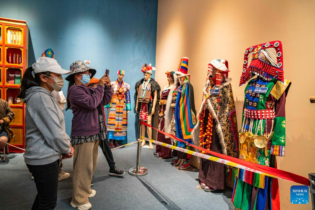 Visitors look at Tibetan costumes at the 5th China Xizang Tourism and Culture Expo in Lhasa, capital of southwest China's Tibet Autonomous Region, June 18, 2023. The expo is one of the most important events on Tibet's cultural calendar. (Xinhua/Sun Fei)