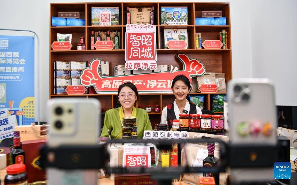 Tibetan specialties are being sold via livestreaming at the 5th China Xizang Tourism and Culture Expo in Lhasa, capital of southwest China's Tibet Autonomous Region, June 18, 2023. The expo is one of the most important events on Tibet's cultural calendar. (Xinhua/Jigme Dorje)