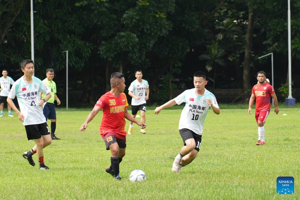 Crew members of Chinese naval training ship Qi Jiguang (Hull 83) take part in a friendship football game with the Philippine Navy members in Manila, the Philippines, June 15, 2023. The Chinese naval training ship Qi Jiguang (Hull 83) departed for China on Saturday after successfully concluding its goodwill visit to the Philippines. (Xinhua)