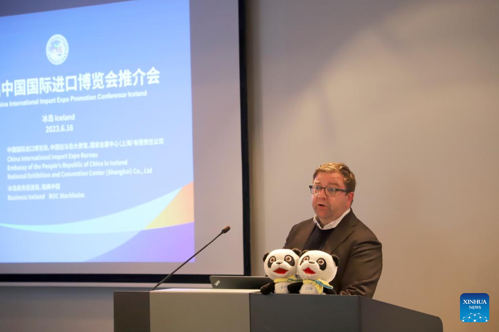 Petur Oskarsson, CEO of Business Iceland, speaks during the 6th China International Import Expo (CIIE) promotion conference in Reykjavik, Iceland, June 16, 2023. CIIE overseas promotion activities came to Iceland for the first time on Friday. Representatives from government organizations of both China and Iceland, as well as local business figures, participated in the event held in Reykjavik, expressing their anticipation for the upcoming sixth CIIE. (Xinhua/Chen Jing)
