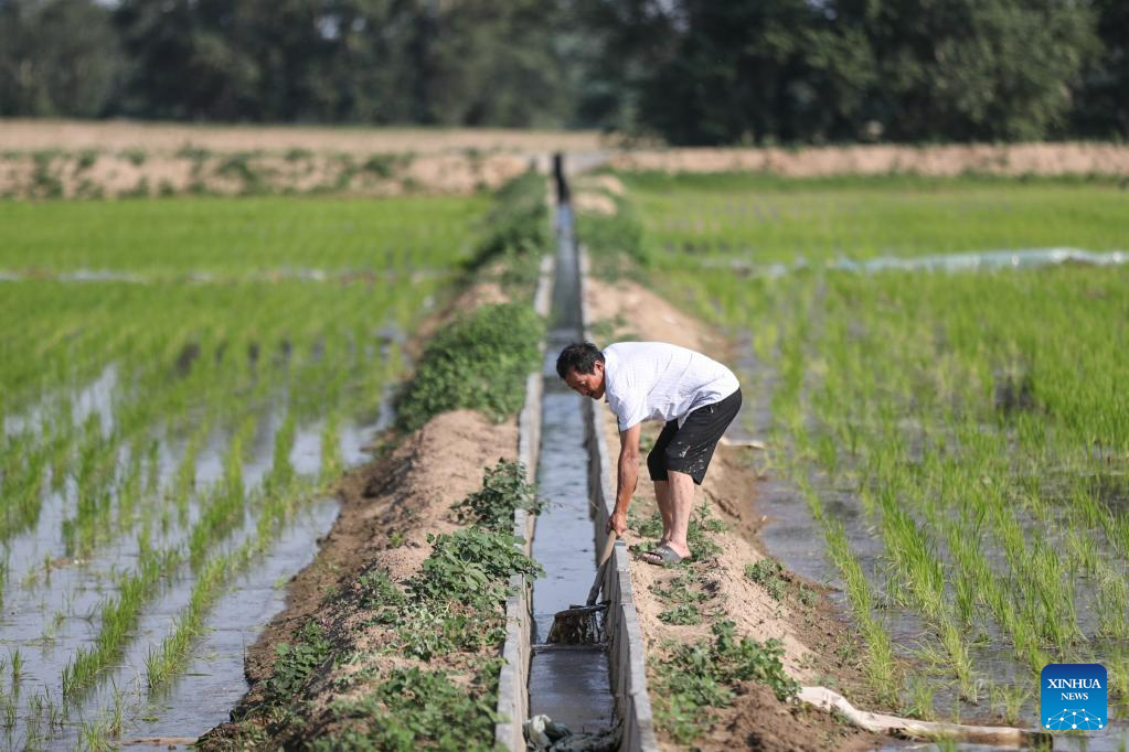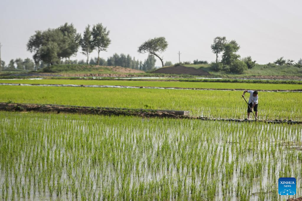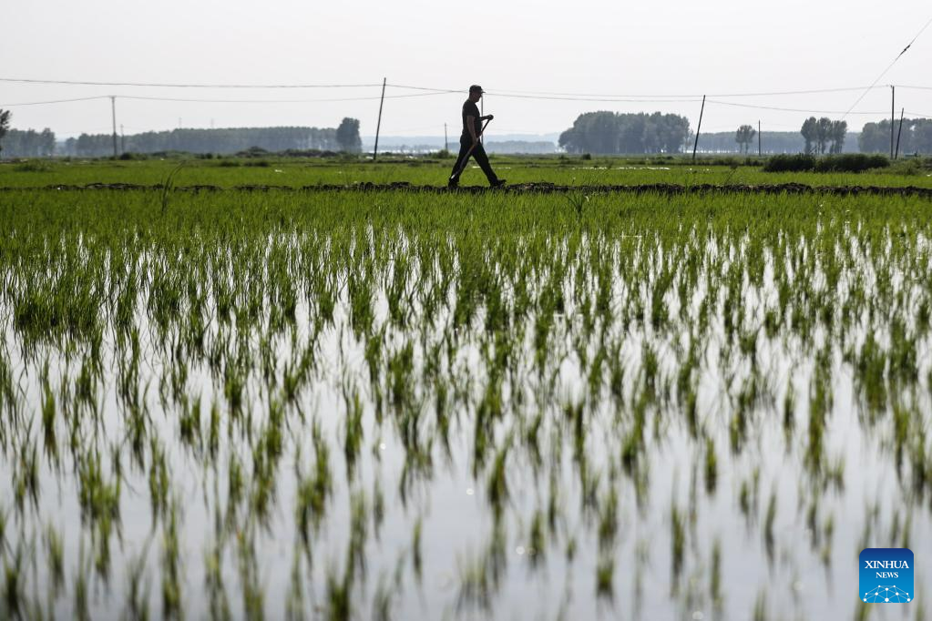A farmer conducts maintenance work in a rice field in Daleng Town of Zhangwu County, Fuxin City, northeast China's Liaoning Province, June 14, 2023. In 2021, local authorities has promoted the transformation of sandy land along the Liuhe River in Zhangwu into cultivable rice fields, achieving ecological and economic benefit. (Xinhua/Pan Yulong)