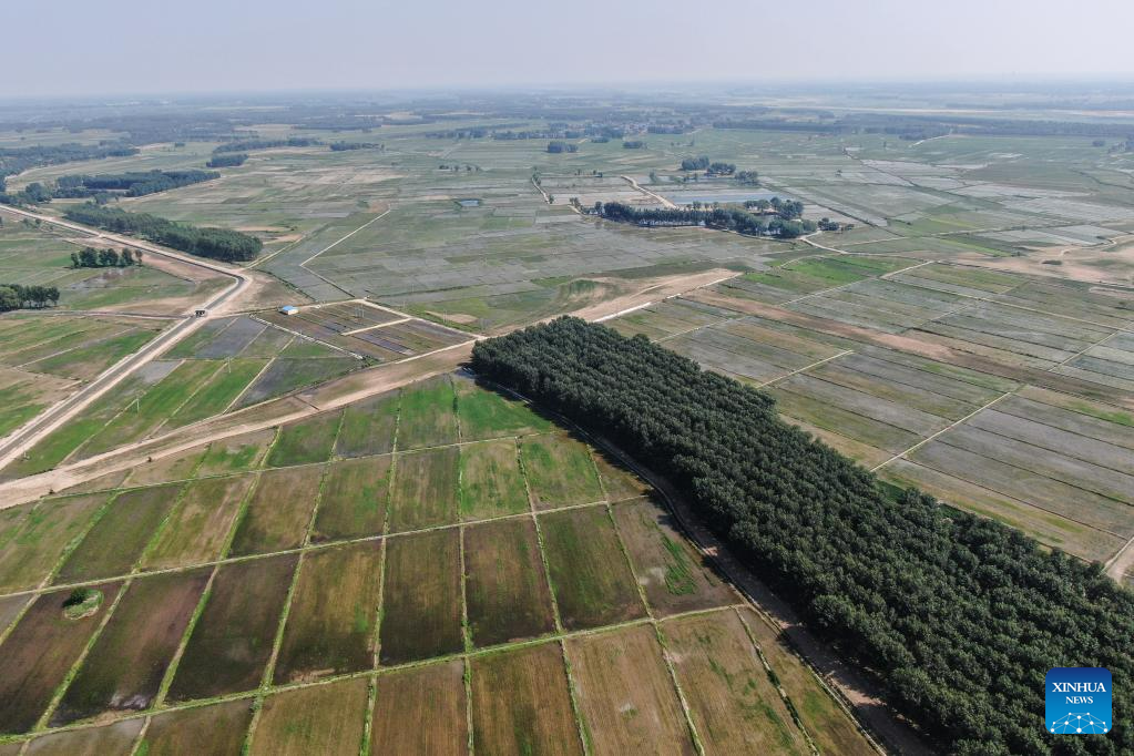 This aerial photo taken on June 14, 2023 shows the rice field in Daleng Town of Zhangwu County, Fuxin City, northeast China's Liaoning Province. In 2021, local authorities has promoted the transformation of sandy land along the Liuhe River in Zhangwu into cultivable rice fields, achieving ecological and economic benefit. (Xinhua/Pan Yulong)