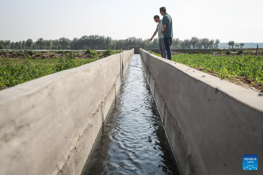 Staff members inspect a water channel in Daleng Town of Zhangwu County, Fuxin City, northeast China's Liaoning Province, June 14, 2023. In 2021, local authorities has promoted the transformation of sandy land along the Liuhe River in Zhangwu into cultivable rice fields, achieving ecological and economic benefit. (Xinhua/Pan Yulong)