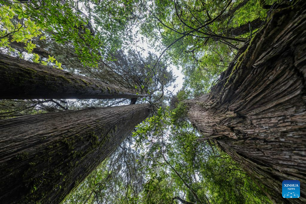 This photo taken on June 15, 2023 shows the giant cypress measuring 102.3 meters at the national nature reserve of the Yarlung Zangbo Grand Canyon in Bome County, Nyingchi City, southwest China's Tibet Autonomous Region. The record of the tallest tree in the Chinese mainland has been refreshed several times in the past year or so. (Xinhua/Shao Zedong)