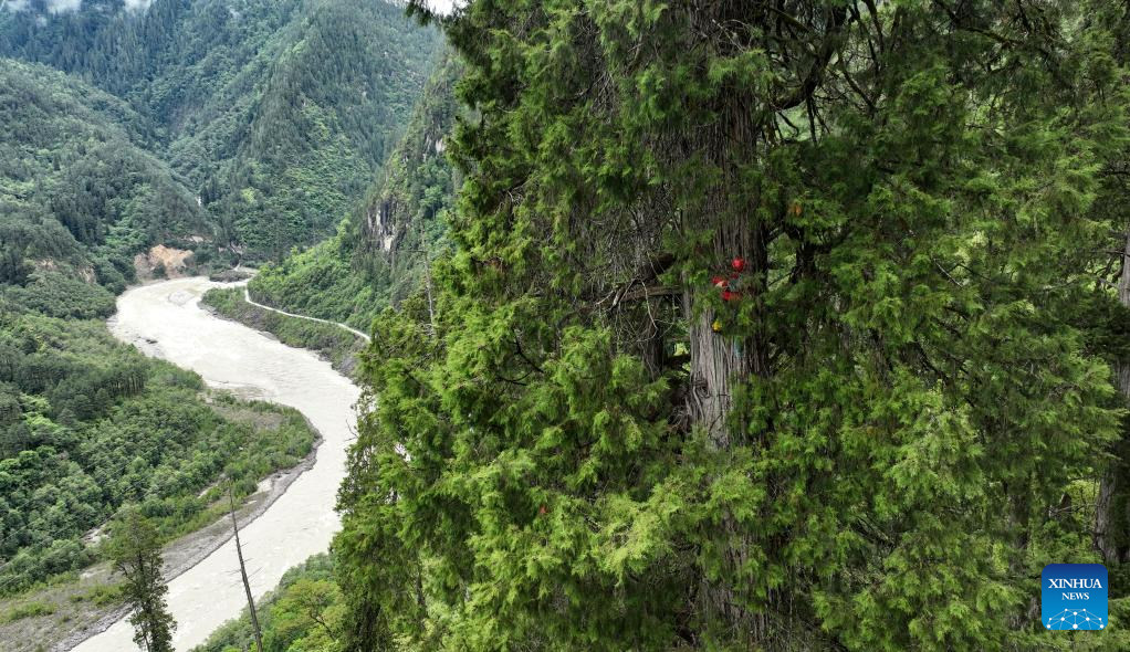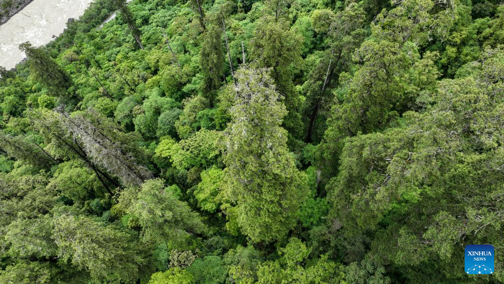 This aerial photo taken on June 15, 2023 shows a view of the home to the tallest tree in Asia in Bome County, Nyingchi City, southwest China's Tibet Autonomous Region. The record of the tallest tree in the Chinese mainland has been refreshed several times in the past year or so. (Xinhua/Jigme Dorje)