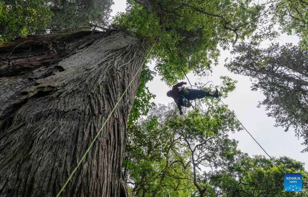 An expedition professional climbs the giant cypress measuring 102.3 meters at the national nature reserve of the Yarlung Zangbo Grand Canyon in Bome County, Nyingchi City, southwest China's Tibet Autonomous Region, June 15, 2023. The record of the tallest tree in the Chinese mainland has been refreshed several times in the past year or so. (Xinhua/Fei Maohua)