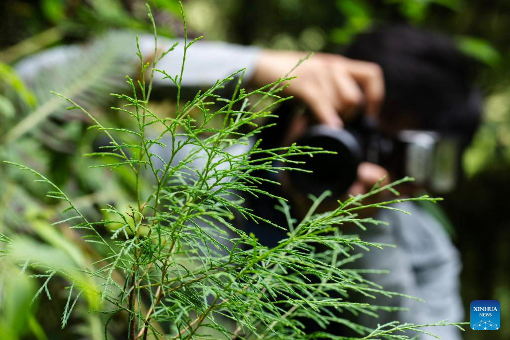 Wang Zi takes pictures of a Cupressus torulosa sapling at the national nature reserve of the Yarlung Zangbo Grand Canyon in Bome County, Nyingchi City, southwest China's Tibet Autonomous Region, June 15, 2023. The record of the tallest tree in the Chinese mainland has been refreshed several times in the past year or so. (Xinhua/Fei Maohua)
