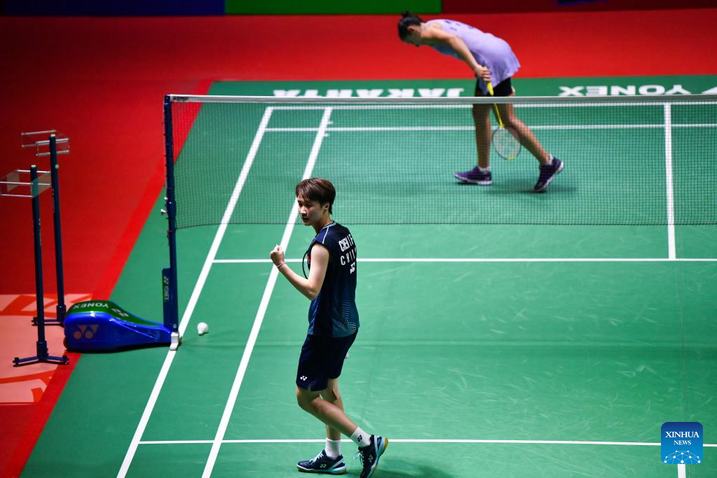 Chen Yufei of China celebrates after winning the women's singles final against Carolina Marin of Spain at 2023 Indonesia Open badminton tournament in Jakarta, Indonesia, June 18, 2023. (Xinhua/Xu Qin)