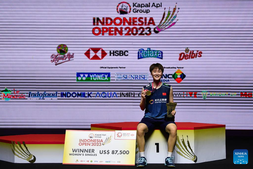 Gold medalist Chen Yufei of China poses during the awarding ceremony after winning the women's singles final against Carolina Marin of Spain at 2023 Indonesia Open badminton tournament in Jakarta, Indonesia, June 18, 2023. (Xinhua/Xu Qin)