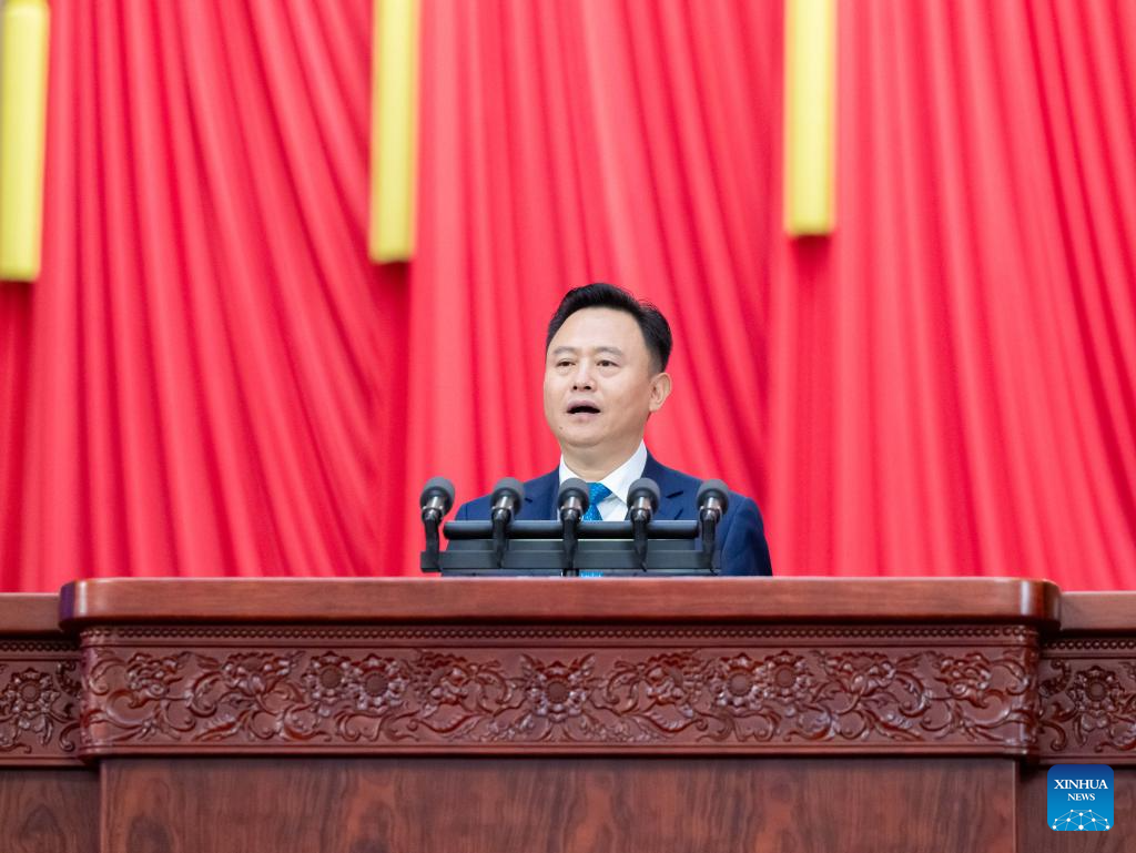Xu Liuping, secretary of the leading Party members group of the All-China Federation of Trade Unions (ACFTU), extends congratulations to the 19th national congress of the Communist Youth League of China (CYLC) on behalf of the ACFTU, the All-China Women's Federation, the China Federation of Literary and Art Circles, and other people's organizations in Beijing, capital of China, June 19, 2023. The CYLC convened its 19th national congress at the Great Hall of the People in Beijing on Monday. (Xinhua/Zhai Jianlan)