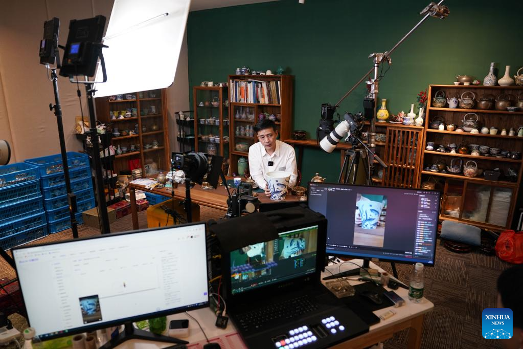 A staff member promotes porcelain products via a livestreaming show at Taoxichuan ceramic art avenue in Jingdezhen, east China's Jiangxi Province, Feb. 22, 2023. (Xinhua/Zhou Mi)