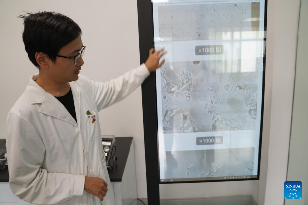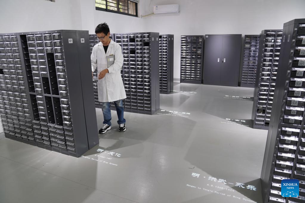 A staff member shows research data of porcelain fragments at Jingdezhen Imperial Kiln Institute in Jingdezhen, east China's Jiangxi Province, May 16, 2023. (Xinhua/Zhou Mi)